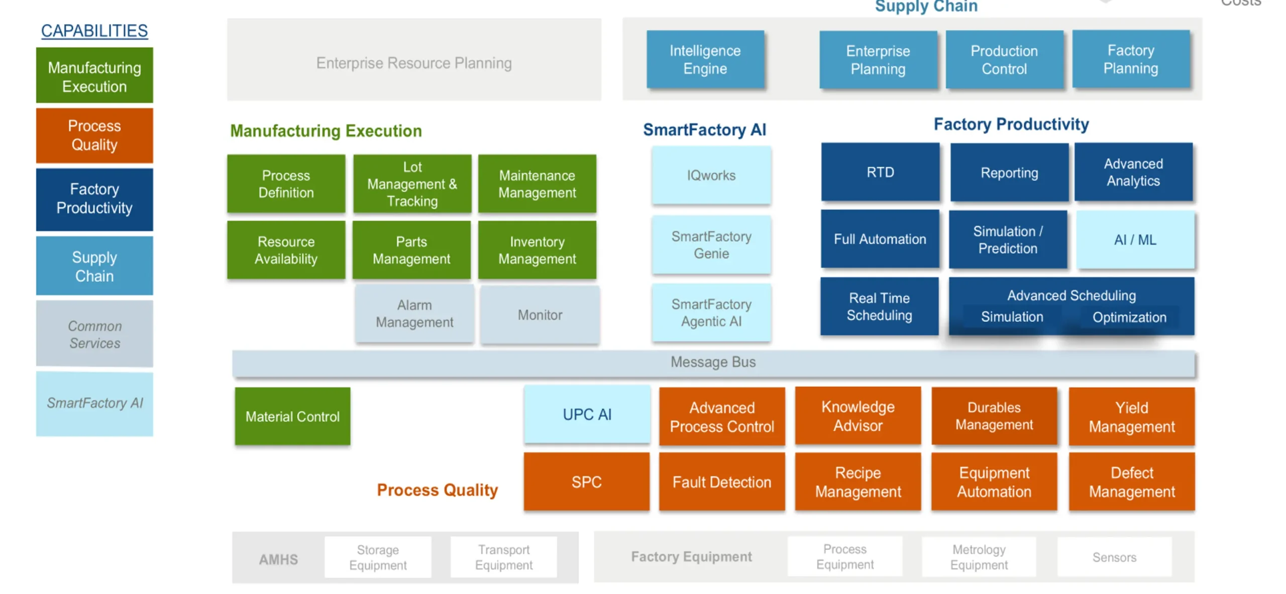 Fault detection and classification entails looking at the combination of physical, chemical, and visible inspection data combined with equipment sensor data to conduct classification and detection. In wafer fabs, however, this is done at a much higher scale and volume of data. A typical tech stack for a semi wafer fab, as shown in figure 1, has everything necessary to run lights out manufacturing. This includes automation of material movements, the manufacturing execution system, process quality, productivity (including scheduling), asset management, and preventive maintenance. It is the soup-to-nuts solution for a wafer fab.