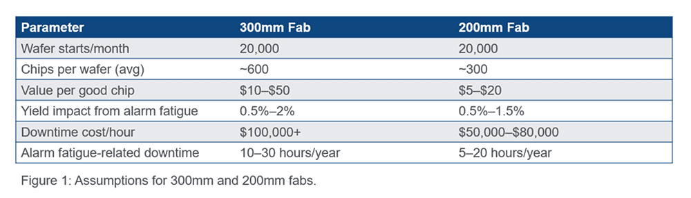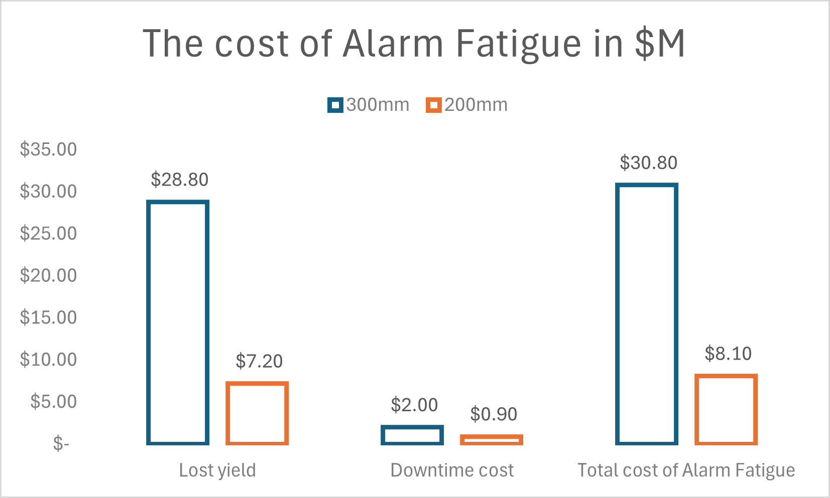 Based on these assumptions for 300mm fabs, the potential economic consequence of alarm fatigue, as shown in Figure 1, is: